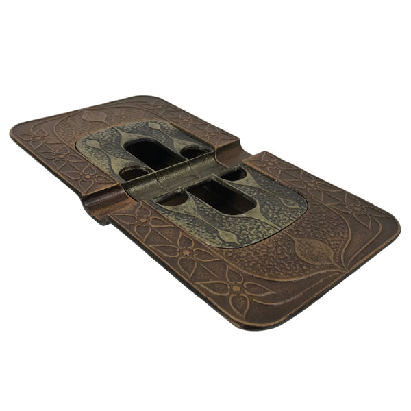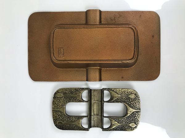 This is a vintage Japanese metal ashtray (haizara). Light brown base and dark brown lid comprise this rectangular ashtray. The base has wide edges with a floral and leaf design that continues on the lid. There are some holes and indentations in the center for holding tobacco. It has a signature on the bottom. It comes with the original cardboard box.