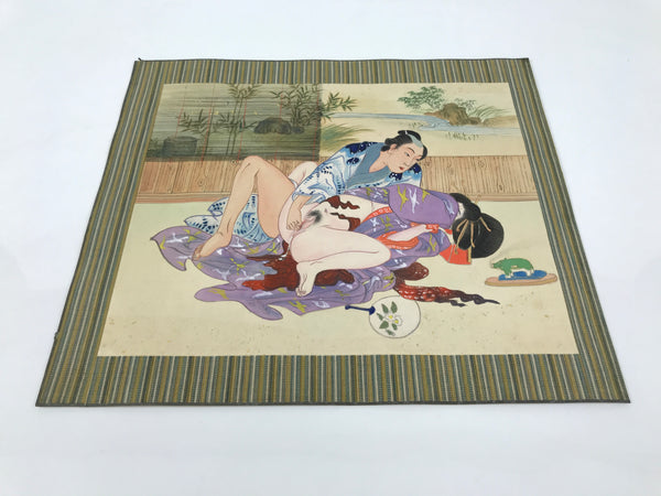 This is a Japanese erotic shunga hand-painted piece. It depicts a man and a woman. A stream can be seen outside a window. There are a folding fan and a stand with a mosquito coil on the floor. The picture is painted on silk, attached to a thick sheet of washi paper.