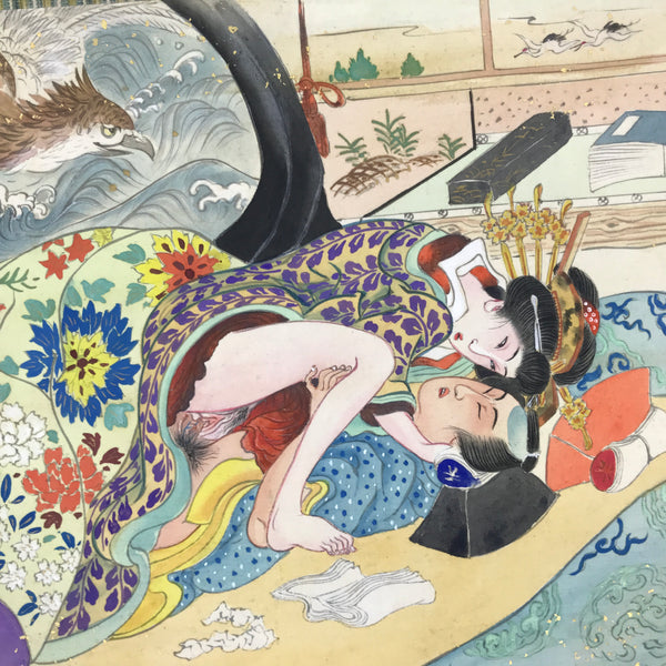 This is a Japanese erotic shunga hand-painted piece. It depicts a man and a woman, possibly an oiran. The couple is indoors. There is a detail with a bird flying over waves on the left of the scene. The picture is painted on silk, attached to a thick sheet of washi paper.