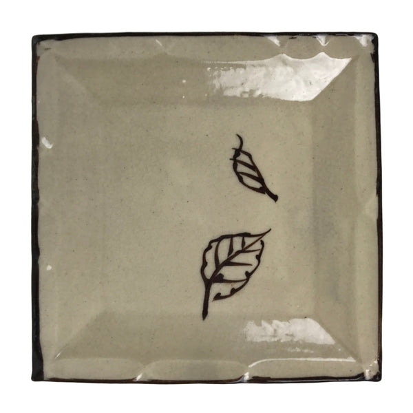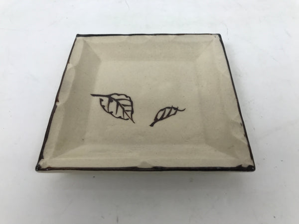 This is a vintage Japanese ceramic pottery plate. This small-sized square plate, also called sara or kozara, has a light beige glaze with a brown border and a painted brown leaf design. It also has a decorative grooved edge. This item is perfect for small side dishes, condiments, dipping sauces, or simply to hold small jewelry or keys.