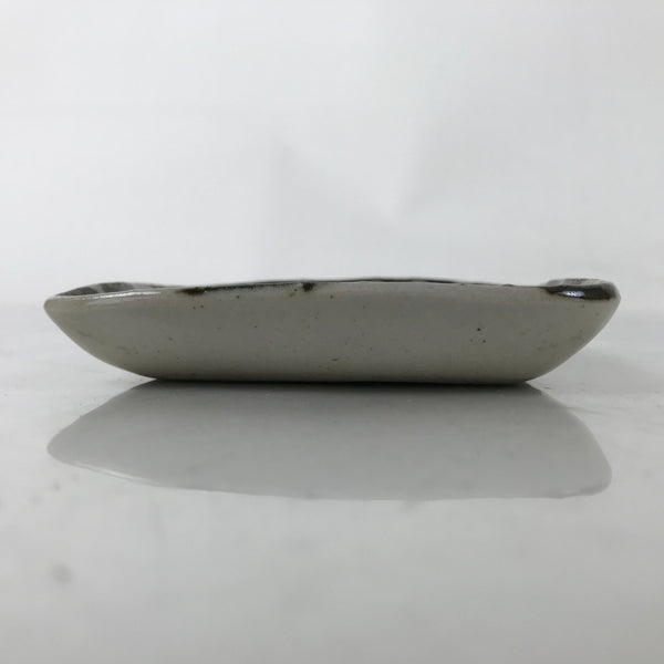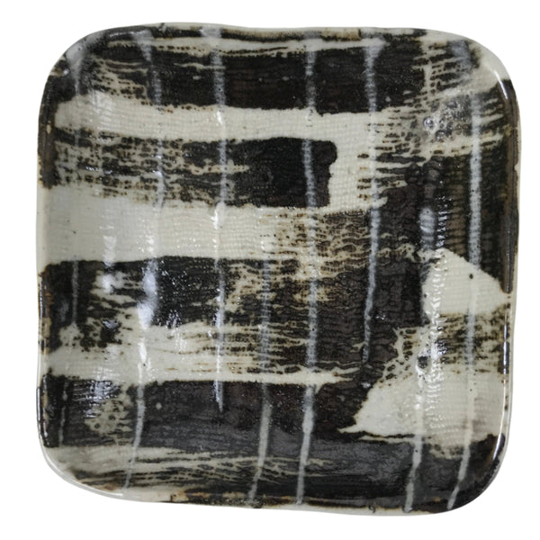 This is a vintage Japanese ceramic pottery plate. This square small-sized plate, also called sara or kozara, has a gray base color with black brush strokes and a white line overlay. The glaze has a rough texture throughout. This item is perfect for small side dishes, condiments, dipping sauces, or simply to hold small jewelry or keys.
