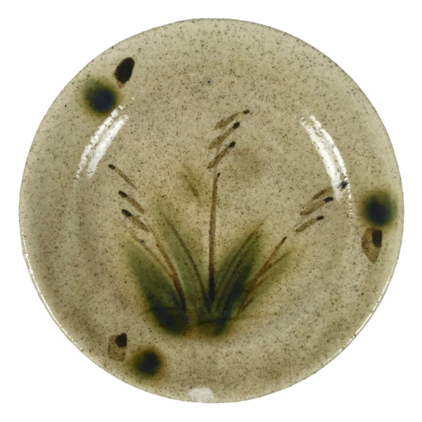 This is a vintage Japanese tiny ceramic plate. Mostly a sandy beige color, this plate features a green and brown plant design.