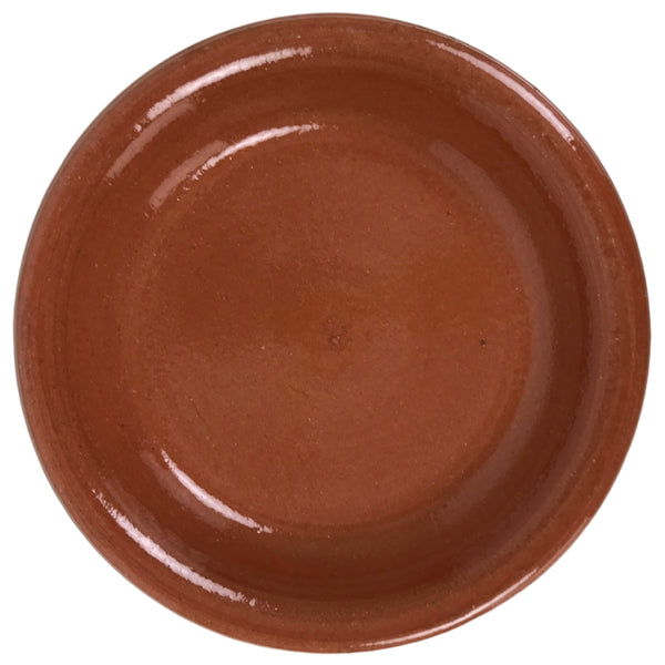 This is a vintage Japanese terracotta plate. It is a medium size with lifted edges so it can double as a pasta or salad plate. It is made of red clay and has a clear glaze over the front side with an unglazed bottom.