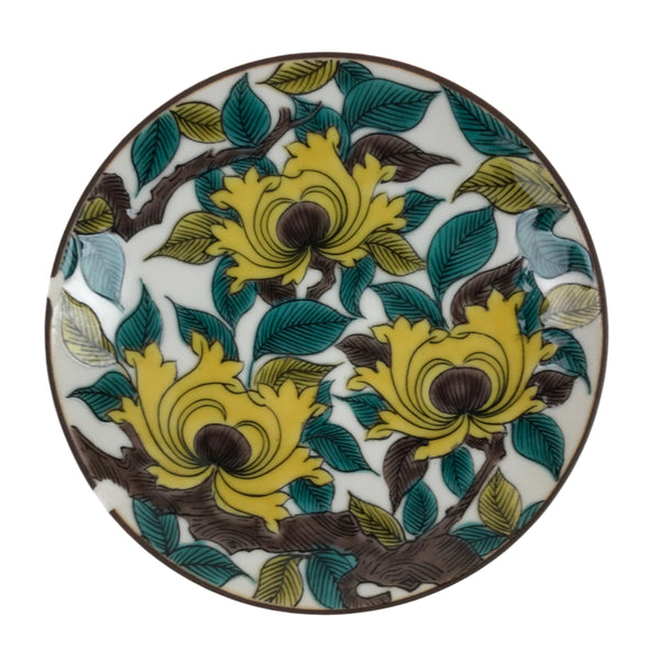 This is a vintage Japanese porcelain plate. This round, small plate, also called mamezara, features a lush yellow peony (botan) design with bright green leaves on branches. It is a vibrant example of kutani ware pottery and is from the seikou kiln. Mamezara are tiny plates in a Japanese tableware set that typically hold dipping sauces such as soy sauce, garnishes, and other condiments. It is also the perfect size for holding small jewelry.