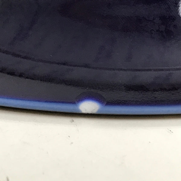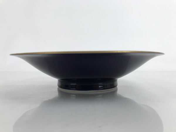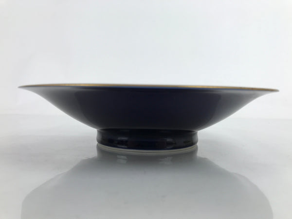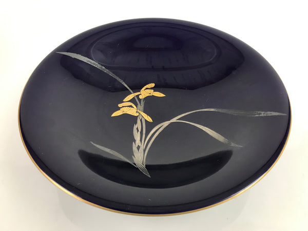 This is a vintage Japanese porcelain decorative serving plate (sara). It is a gorgeous cobalt blue with a gold painted rim. At the center are two iris blooms with silvery leaves. This medium-sized plate has slightly raised sides and is an excellent choice for serving stylized dishes, salads, or sashimi. It can also be used as a display piece.