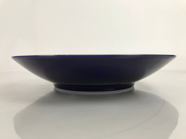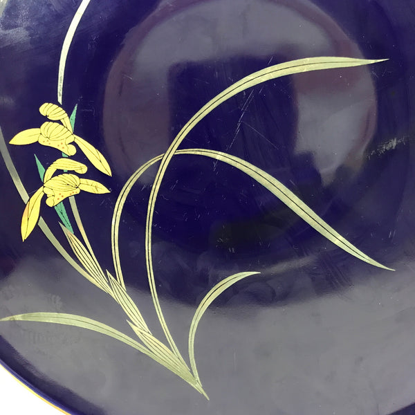 This is a vintage Japanese porcelain decorative serving plate (sara). It is a gorgeous cobalt blue with a gold painted rim. At the center are two iris blooms with silvery leaves. This large-sized plate has slightly raised sides and is an excellent choice for serving stylized dishes, salads, or sashimi. It can also be used as a display piece.