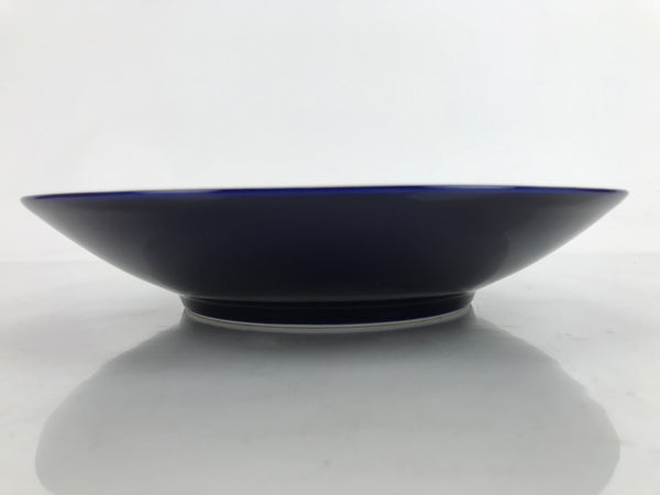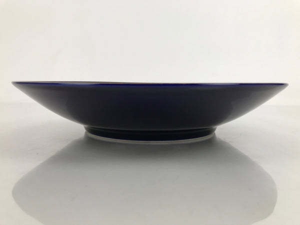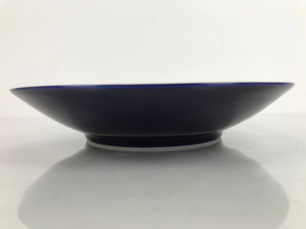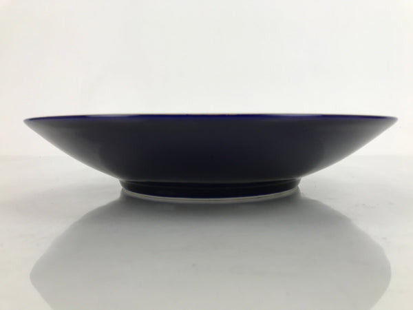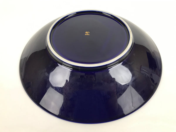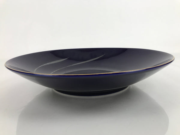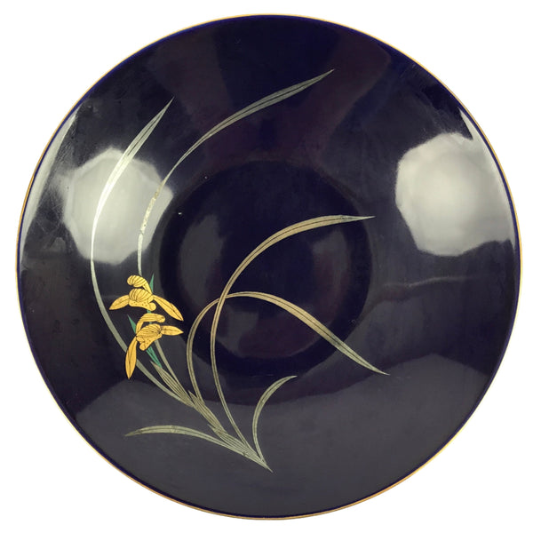 This is a vintage Japanese porcelain decorative serving plate (sara). It is a gorgeous cobalt blue with a gold painted rim. At the center are two iris blooms with silvery leaves. This large-sized plate has slightly raised sides and is an excellent choice for serving stylized dishes, salads, or sashimi. It can also be used as a display piece.
