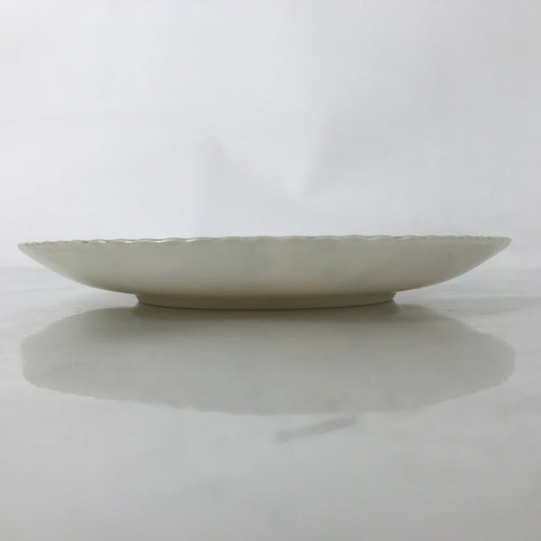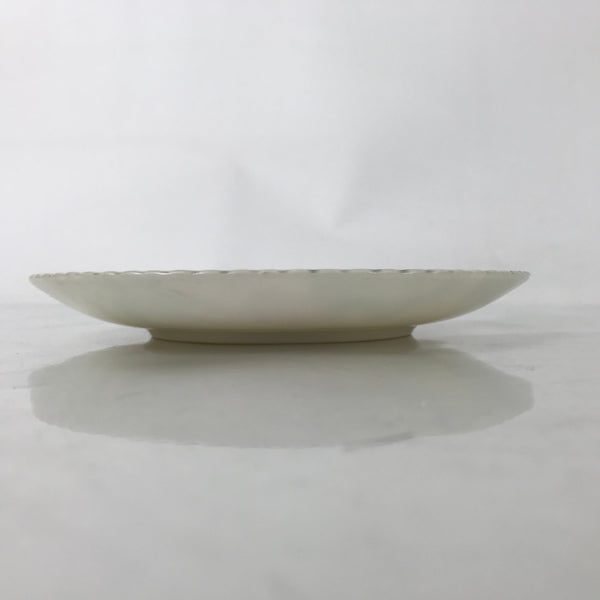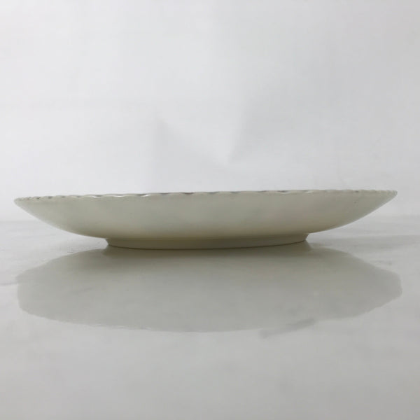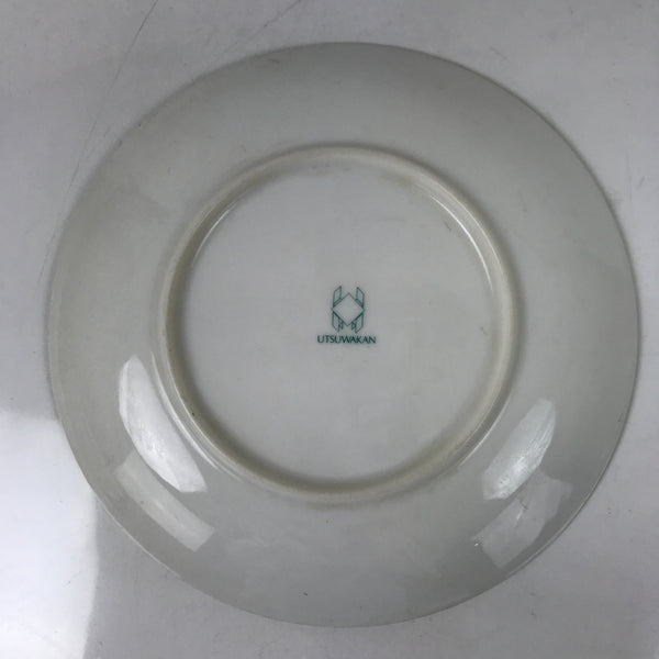 This vintage Japanese medium porcelain plate has a pink floral design with green leaves. It is round with little depth and slightly textured on the front side. This size plate is called chuzara and is good for serving side dishes, some sweets, and so on. The bottom sign Utsuwakan means a house of vessels in Japanese.
