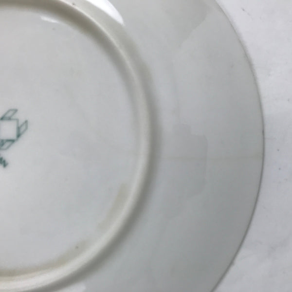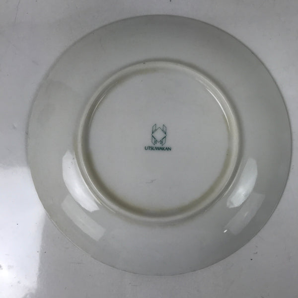This vintage Japanese medium porcelain plate has a pink floral design with green leaves. It is round with little depth and slightly textured on the front side. This size plate is called chuzara and is good for serving side dishes, some sweets, and so on. The bottom sign Utsuwakan means a house of vessels in Japanese.