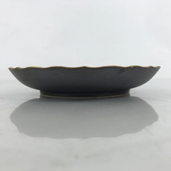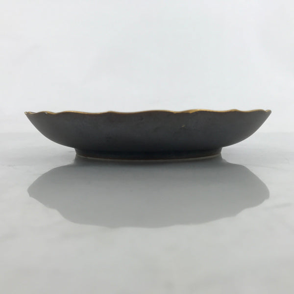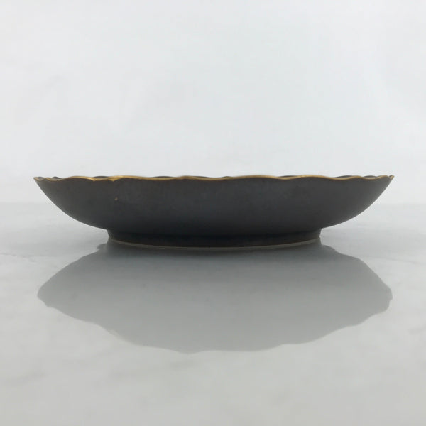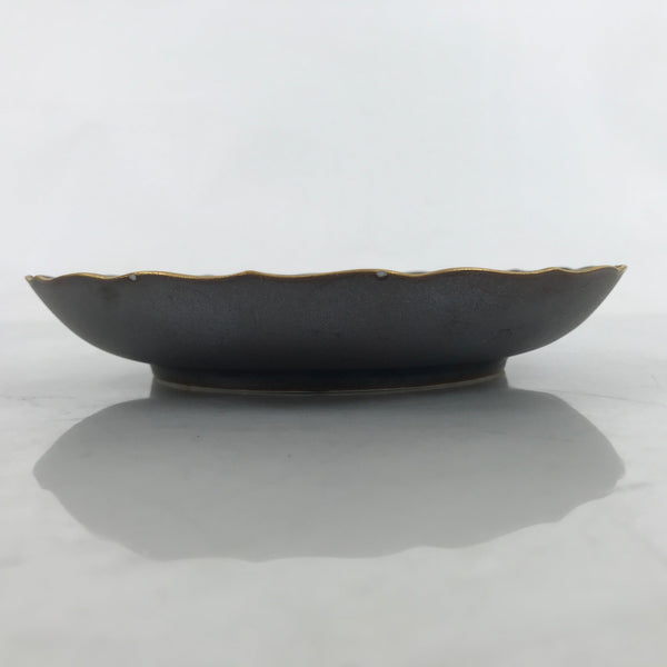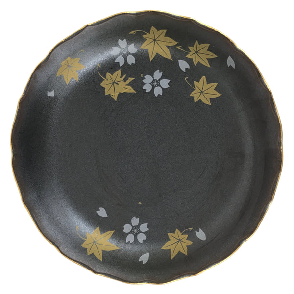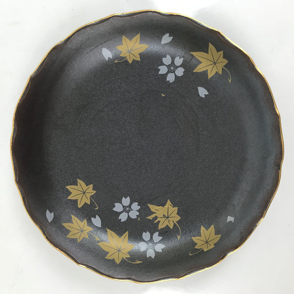 This is a vintage Japanese ceramic plate. This round, small-sized plate, also called sara or kozara, is a very dark brown with gold maple leaves (momiji) and silver cherry blossoms (sakura).