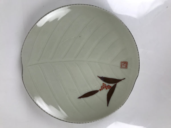 This is a vintage Japanese porcelain plate. This round, small-sized plate, also called sara or kozara, features brown, red, and gold nanten (sacred bamboo). The plate itself has a leaf-like shape with veins. There is a red seal.