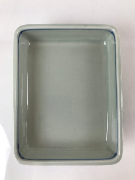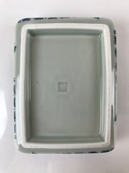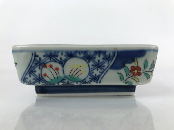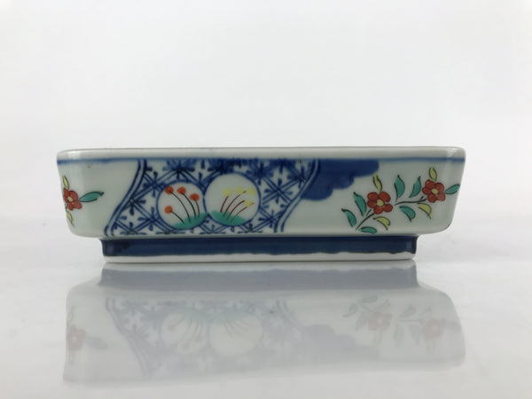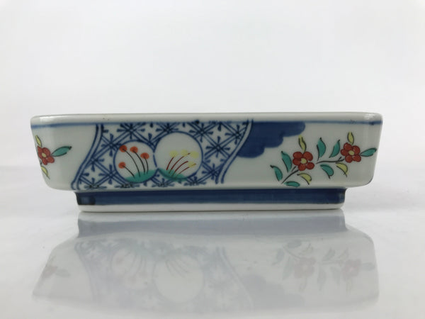 This is a vintage Japanese porcelain plate. This rectangular, small plate, also called kozara, is white with blue, red, and yellow and features floral blooms and buds on the outer sides. Kozara are often used for side dishes and serving desserts. This particular plate is most likely used for single servings of sashimi. There is a maker's stamp on the bottom.