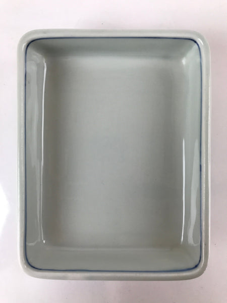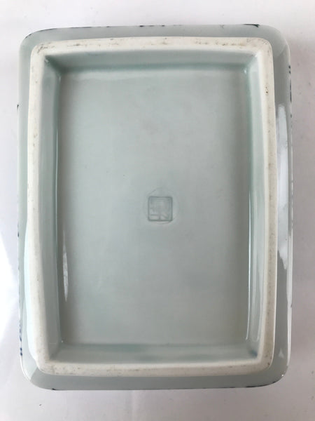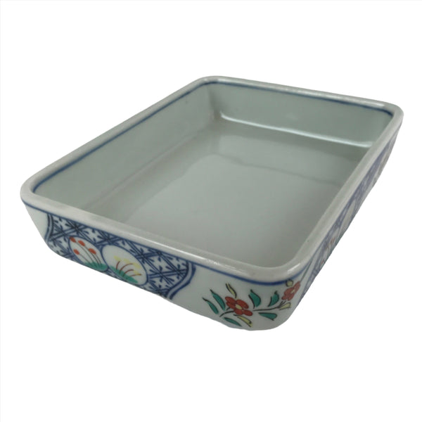 This is a vintage Japanese porcelain plate. This rectangular, small plate, also called kozara, is white with blue, red, and yellow and features floral blooms and buds on the outer sides. Kozara are often used for side dishes and serving desserts. This particular plate is most likely used for single servings of sashimi. There is a maker's stamp on the bottom.