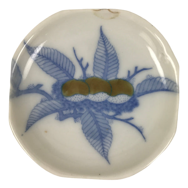 This is a vintage Japanese tiny porcelain plate. Mostly white, this plate has a blue sometsuke design of a branch with leaves and brown chestnuts.