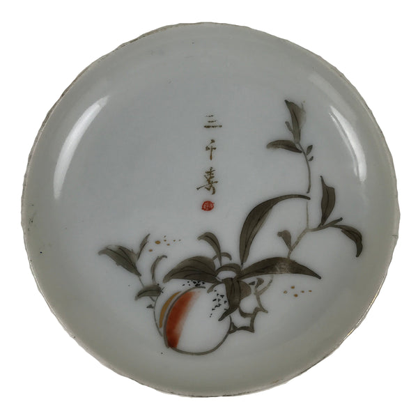 This is a vintage Japanese tiny porcelain plate. Mostly white with gold kanji characters and accents, this piece features a peach with stem and leaves.
