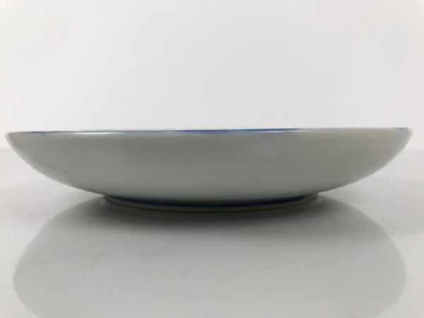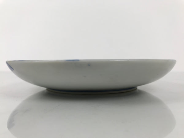 This is a vintage Japanese porcelain plate. This round, small-sized plate, also called sara or kozara, features a sometsuke blue and white combination with pink cherry blossoms with floating petals.