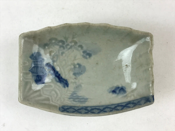 This is a vintage Japanese soy sauce dish, Seiji. It is a small, rounded rectangular shallow bowl or plate meant to hold soy sauce as well as other seasonings for the purpose of dipping. Featuring a mountain temple scene with pine trees and water below, this gray and blue, scalloped-edged little bowl can also hold other food items such as pickles. This is a common dish when eating sashimi, for example.
