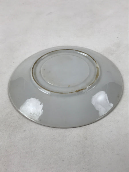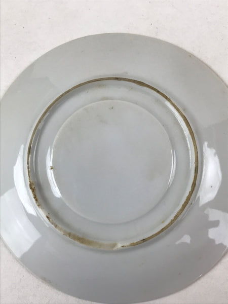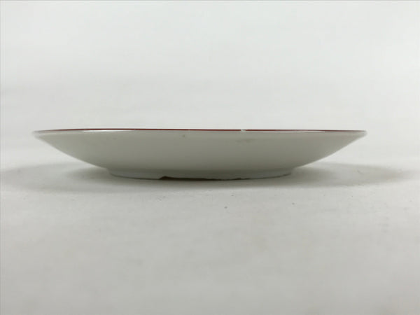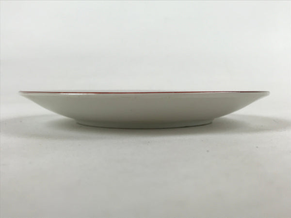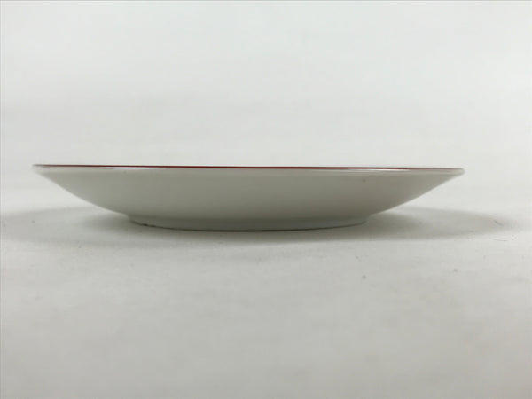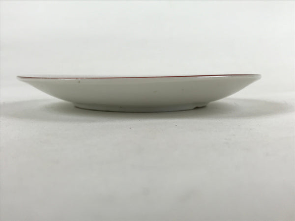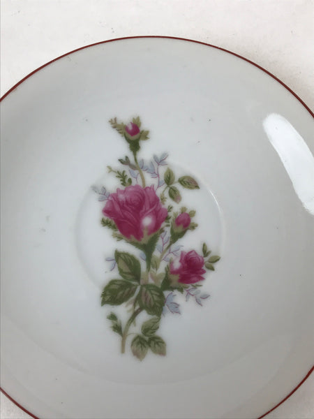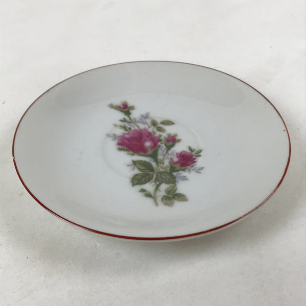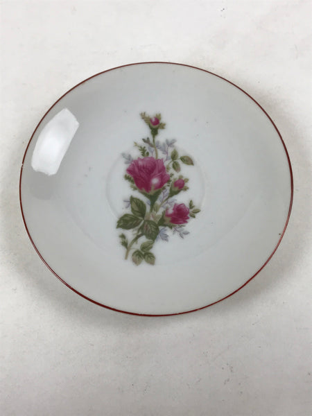 This is a vintage Japanese porcelain teacup saucer (chataku). It can also be used as a small plate (meimeizara). This round plate is mostly white with pink roses and buds and green leaves.  The rim is red. The top surface has an indentation for a cup to fit neatly on it. Though it mainly functions as a saucer, I can also be used as a small plate perfect for putting small food or sweets such as cakes.