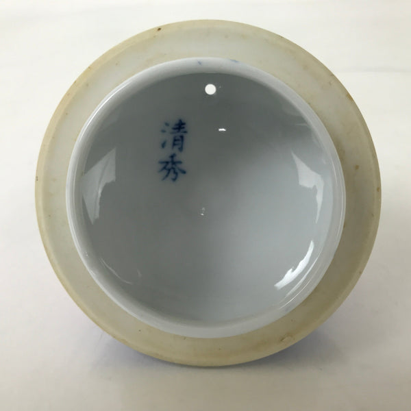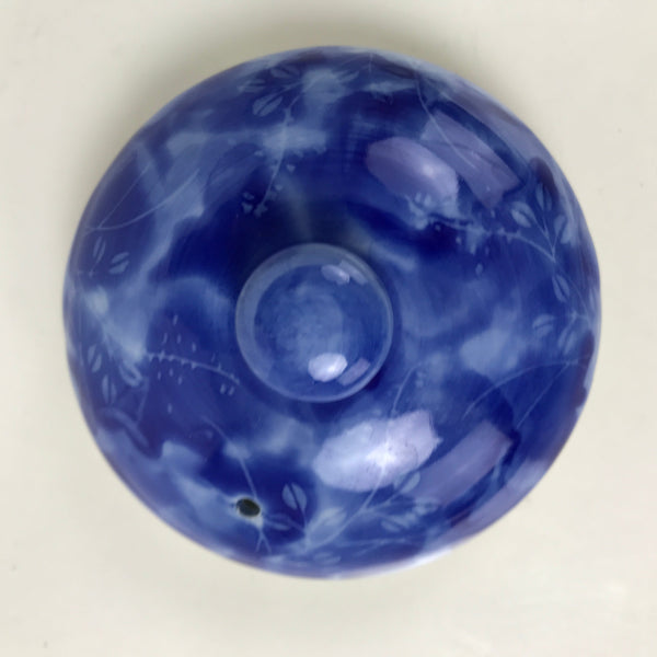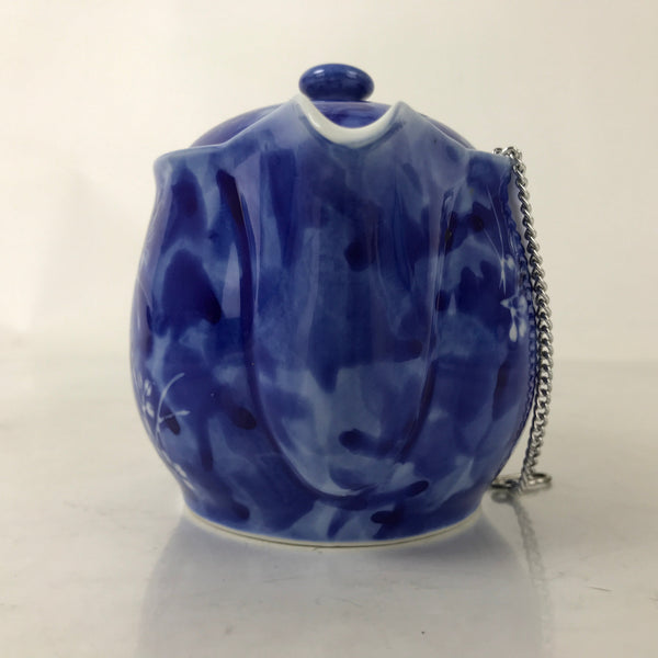 This vintage Japanese Arita Ware lidded ceramic teapot is blue with a white leaf pattern. The handle and mouth have elegant curved shapes. This teapot comes with a metallic tea strainer, which is very handy when using loose leaves. The size is quite compact, perfect for accommodating guests and daily use.