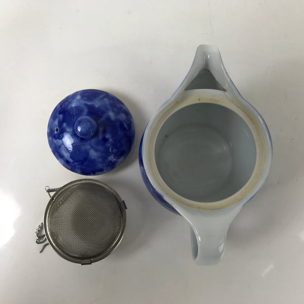 Japanese Arita Ware Ceramic Lidded Teapot Vtg Blue White Leaves W/ Strainer Y248