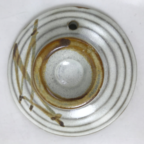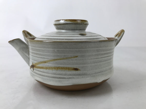 This vintage Japanese Banko ware ceramic teapot-shaped small donabe (earthenware pot) with a matching lid is beige with brown lines on the lid and the pot. This type of small-sized pot is used to serve soups or broth and is often seen in kaiseki food restaurants. It can also be used as a regular teapot. The handle is missing.