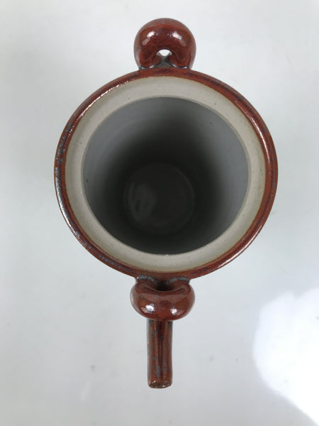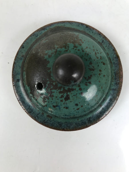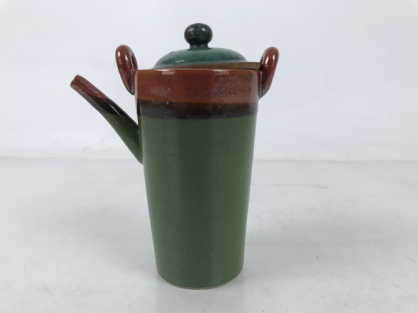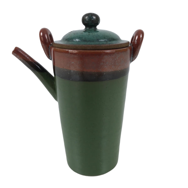 This vintage ceramic lidded teapot is green and brown, with a horizontal black line on the top. It has a compact size and a tall design with two decorative handles at the top. This teapot comes with a matching lid. Due to its size, it can also be used as a saucer. It is perfect for accommodating guests and daily use, and also for interior decor.