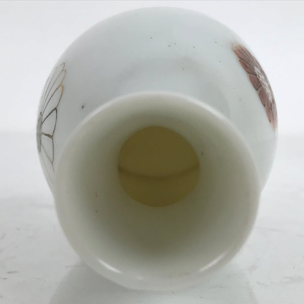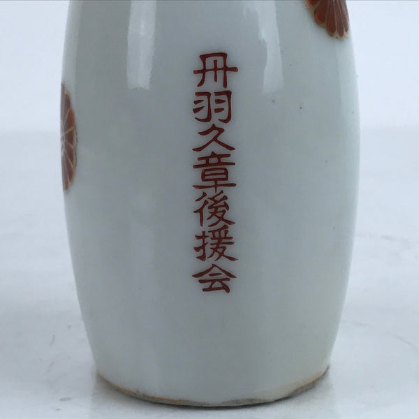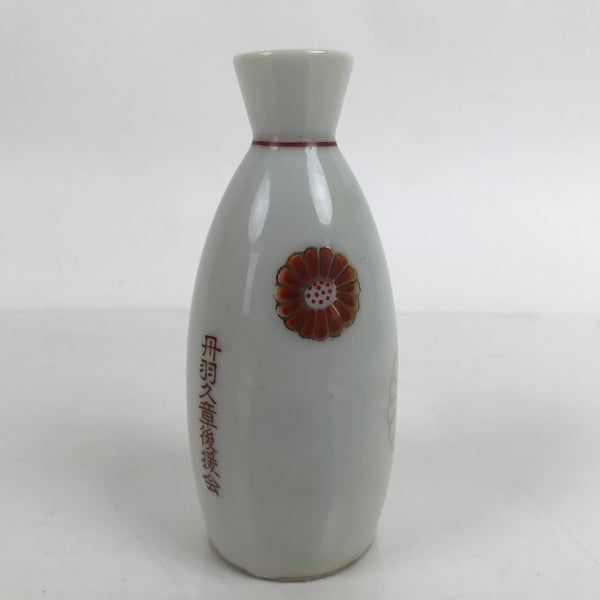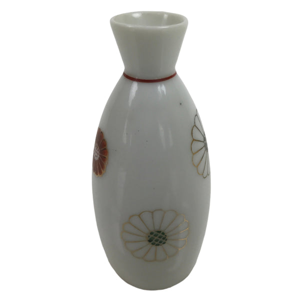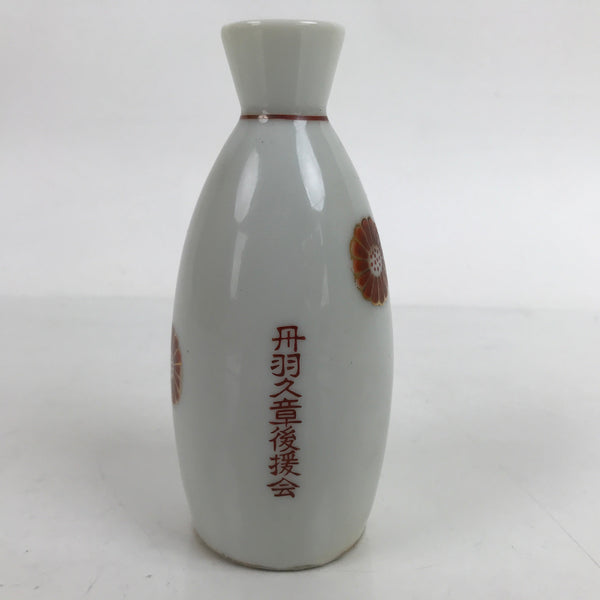 This is a Japanese vintage porcelain sake bottle or Tokkuri. This particular sake bottle is a white with gold-outlined and red chrysanthemums. This piece is promotional goods given by politician Niwa Kyuushou, who formerly served the Aichi Prefecture Assembly as well as the Japanese House of Representatives cabinet. It is a compact size with a generous volume (roughly ichi-go), making it easy to use daily for beverages or as a small flower vase.