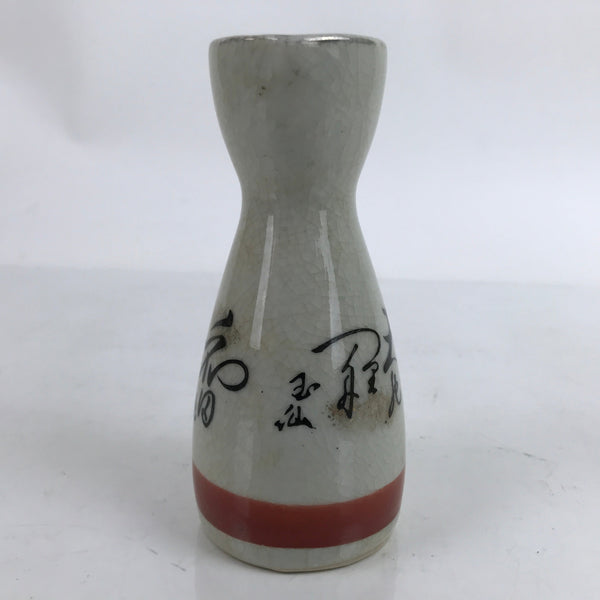This is a Japanese vintage ceramic sake bottle or Tokkuri. This sake bottle has a crackle glaze and features black calligraphy all around as well as a red strip at the bottom. It is a compact size making it easy to use daily for beverages or as a small flower vase.