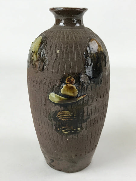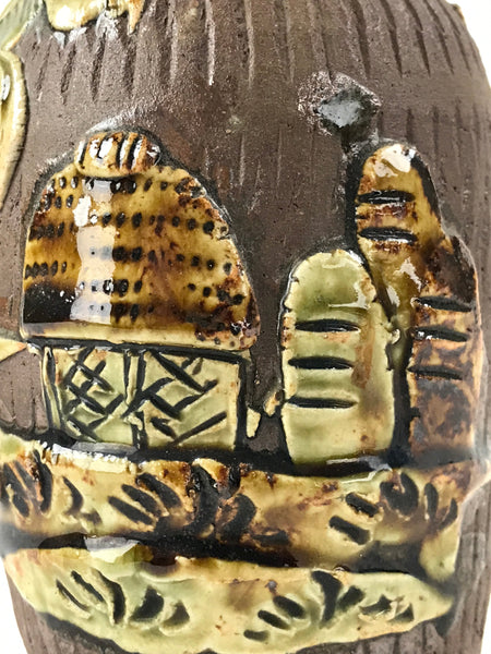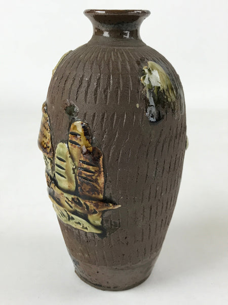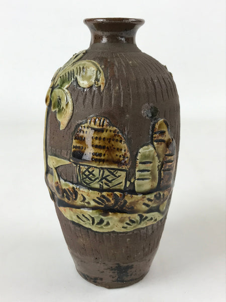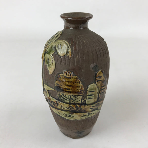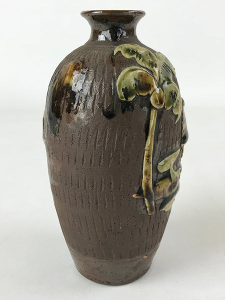 This is a vintage Japanese ceramic sake bottle or Tokkuri. It features a raised, textured image of a seaside tropical village with palm tree. This bottle is mostly brown with green accents. It is approximately a sango or yongo size sake bottle. It can be also used for water, other drinks, or as a vase.
