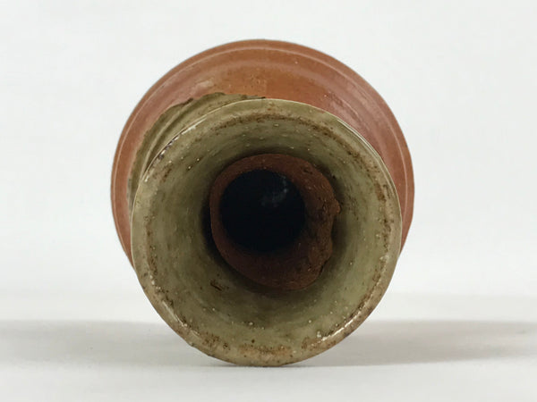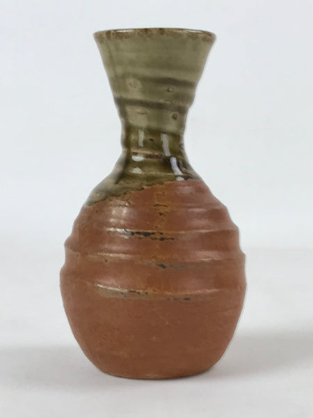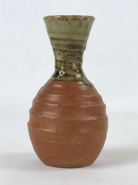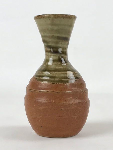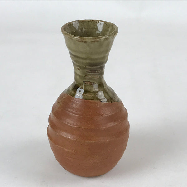 This is a Japanese vintage ceramic sake bottle or Tokkuri. This particular sake bottle has a matte brown base topped with a green glossy glaze. It is a compact size with a wide mouth, easy to use daily.