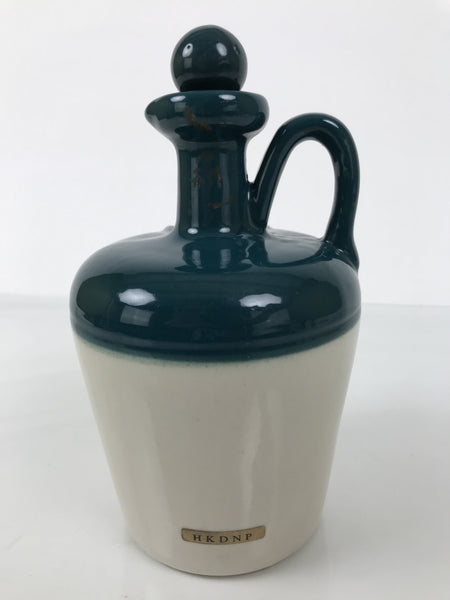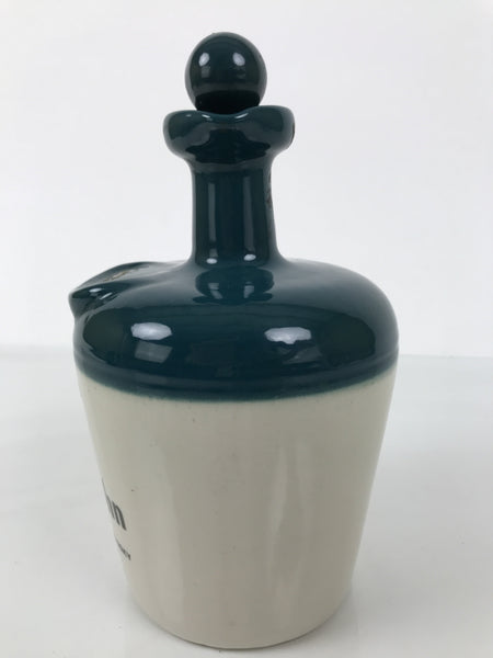This is a vintage empty decanter of Long John Scotch whisky. This decanter is shaped like a jug and two-toned, beige and green. The cap has a cork at the bottom, which fits the bottle opening. The rim has a spout-like shape.