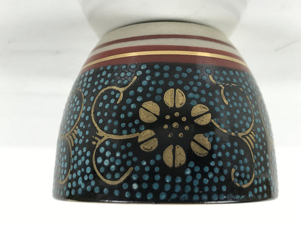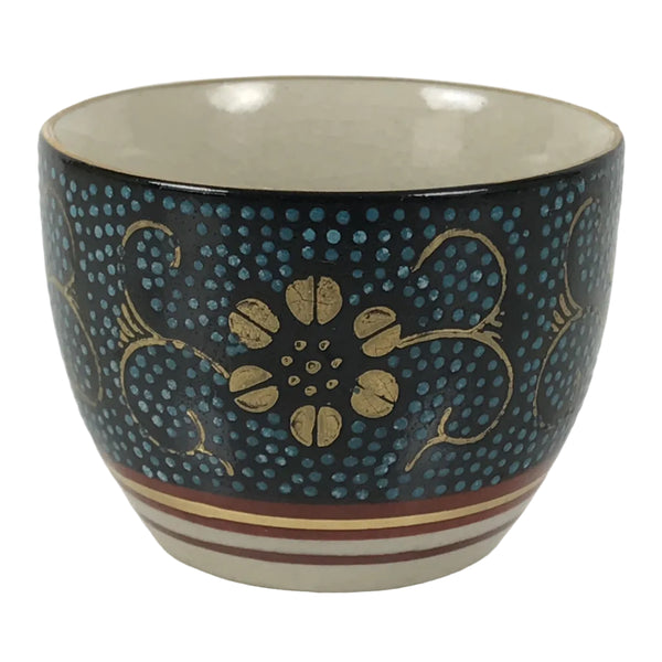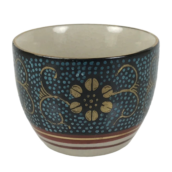 This is a vintage Japanese Kutani porcelain sake cup. This particular type of cup is called tsubomi or "bud type" due to its resemblance to a flower bud. In terms of size, it is also called ochoko. This beautiful imari sake cup is fully decorated with precise gold linework of flowers and vines on a raised-texture blue dotted background. There is a red and gold banded line near the base for one extra touch of color. The inside is solid white. It has the Kutani marking on the bottom.