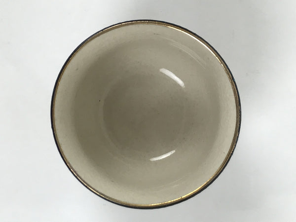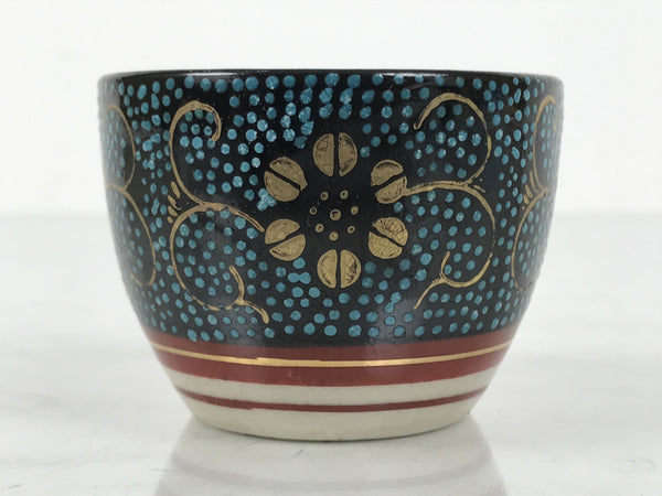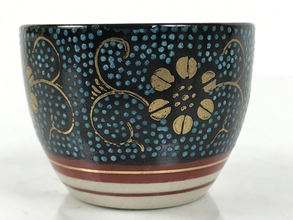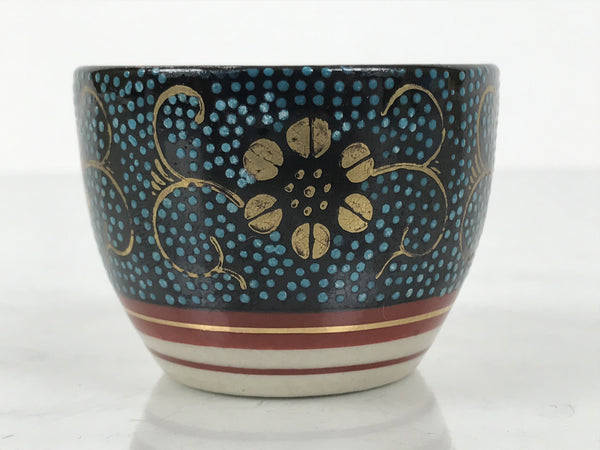 This is a vintage Japanese Kutani porcelain sake cup. This particular type of cup is called tsubomi or "bud type" due to its resemblance to a flower bud. In terms of size, it is also called ochoko. This beautiful imari sake cup is fully decorated with precise gold linework of flowers and vines on a raised-texture blue dotted background. There is a red and gold banded line near the base for one extra touch of color. The inside is solid white. It has the Kutani marking on the bottom.