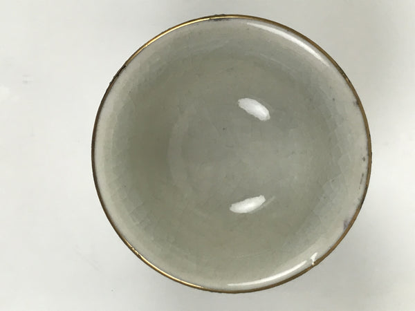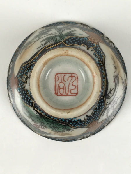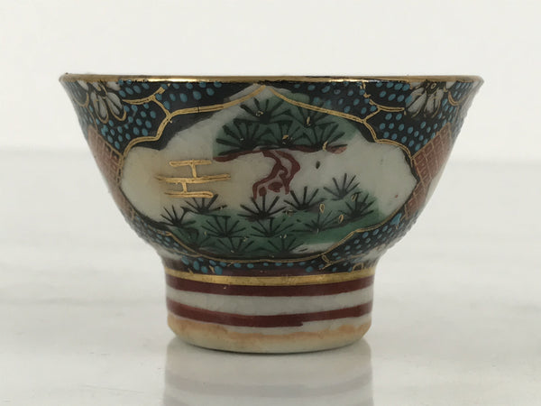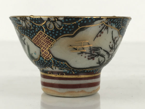 This is a vintage Japanese Kutani porcelain sake cup. This particular type of cup is called wan or "bowl type" due to its resemblance to a rice bowl. In terms of size, it is also called ochoko. This beautiful imari sake cup is fully decorated with precise gold linework surrounding a shochikubai (Pine, plum blossom, bamboo) motif on a raised-texture blue dotted background. Each scene is beautifully illustrated with green, gold, and red. The inside is a grayish-beige. It has a red Kutani marking on the bottom.