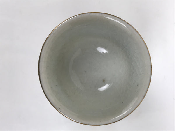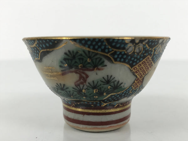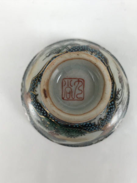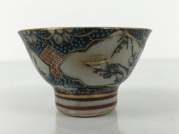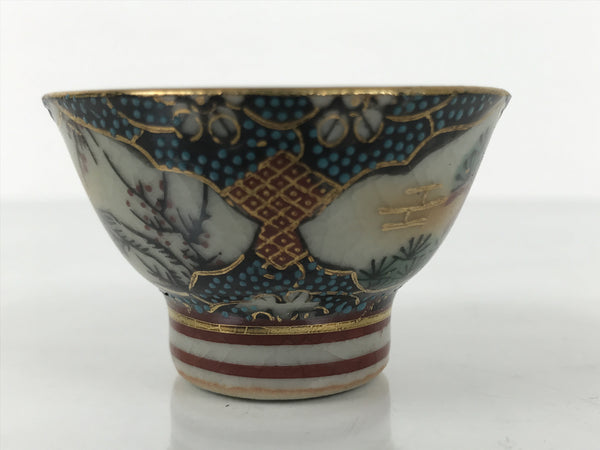 This is a vintage Japanese Kutani porcelain sake cup. This particular type of cup is called wan or "bowl type" due to its resemblance to a rice bowl. In terms of size, it is also called ochoko. This beautiful imari sake cup is fully decorated with precise gold linework surrounding a shochikubai (Pine, plum blossom, bamboo) motif on a raised-texture blue dotted background. Each scene is beautifully illustrated with green, gold, and red. The inside is a grayish-beige. It has a red Kutani marking on the bottom.
