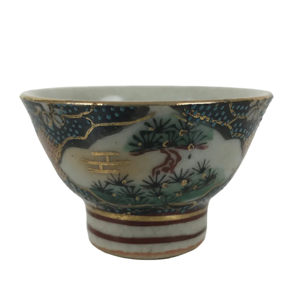 This is a vintage Japanese Kutani porcelain sake cup. This particular type of cup is called wan or "bowl type" due to its resemblance to a rice bowl. In terms of size, it is also called ochoko. This beautiful imari sake cup is fully decorated with precise gold linework surrounding a shochikubai (Pine, plum blossom, bamboo) motif on a raised-texture blue dotted background. Each scene is beautifully illustrated with green, gold, and red. The inside is a grayish-beige. It has a red Kutani marking on the bottom.