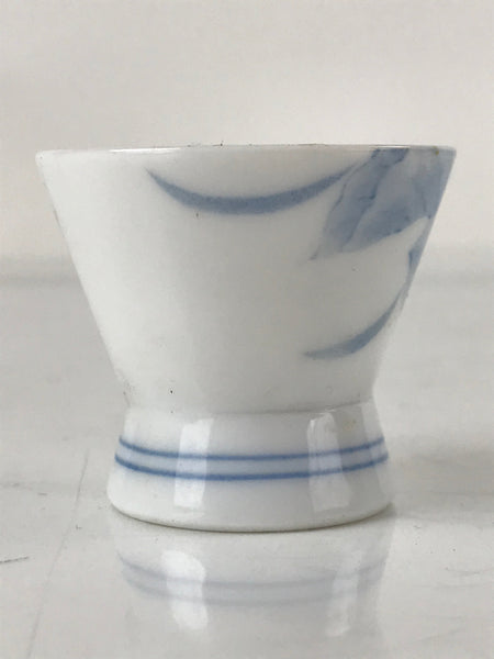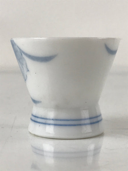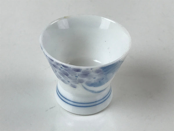 This is a vintage Japanese porcelain sake cup. This particular type of cup is called wan or "bowl type" due to its wide mouth and resemblance to a rice or tea bowl. In terms of size, it is also called ochoko. This footed cup is a stark white with purple hydrangea blooms and blue-colored leaves. The foot also has a blue double-line pattern.