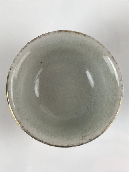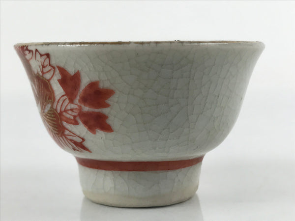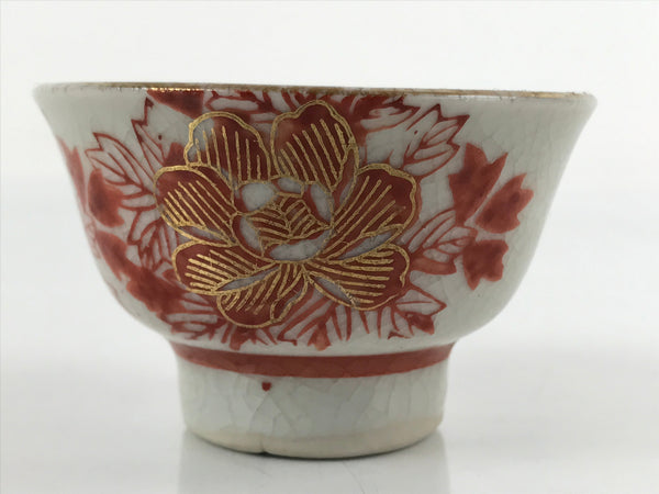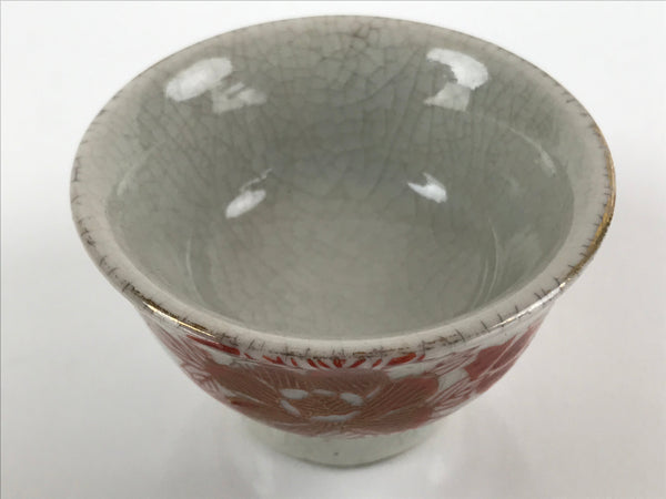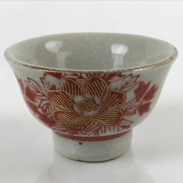 This is a vintage Japanese porcelain sake cup. This particular type of cup is called wan or "bowl type" due to its more open diameter. In terms of size, it is also called guinomi. This footed cup is a light gray crackle glaze with beautiful red and gold painted peony flowers.