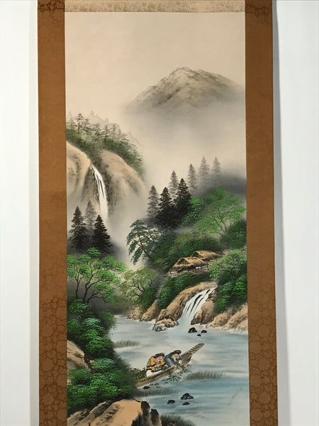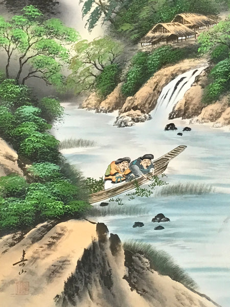 This vintage Japanese boxed hanging scroll (called kakejiku or makimono) features two men on a boat collecting river-weed plants. There is a high mountain in the background, and some houses and waterfalls. Various types of trees are also painted. This type of kakejiku is called sansui, literally mountains and water. It is painted in color, mostly green, brown, and blue. This piece is signed with a name and a red seal. The box has inscriptions on the outside and the inside of the lid.