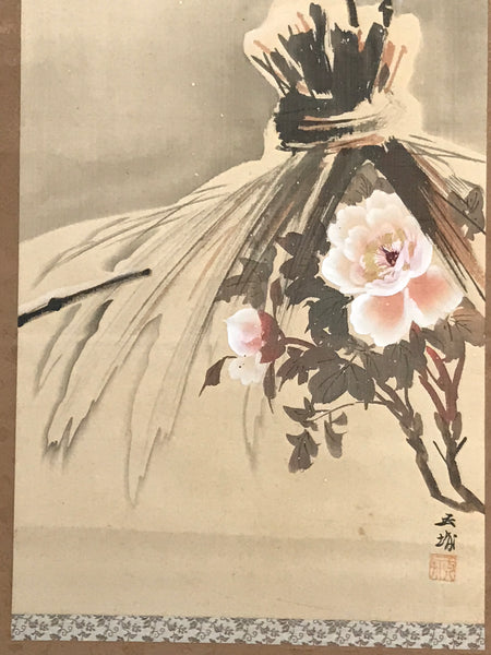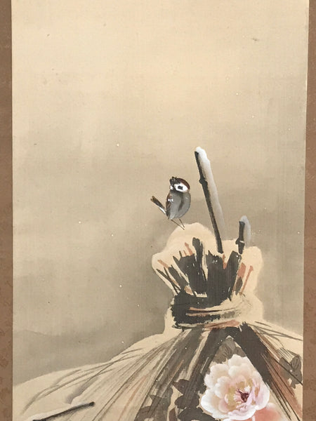 This vintage Japanese hanging scroll (kakejiku or makimono) represents a peony (botan) bush with flowers placed under a protective rice-straw mat called warabocchi in Japanese. There is snow on the mat, and a bird is standing at the top of it. This piece is signed with a name and a red seal.
