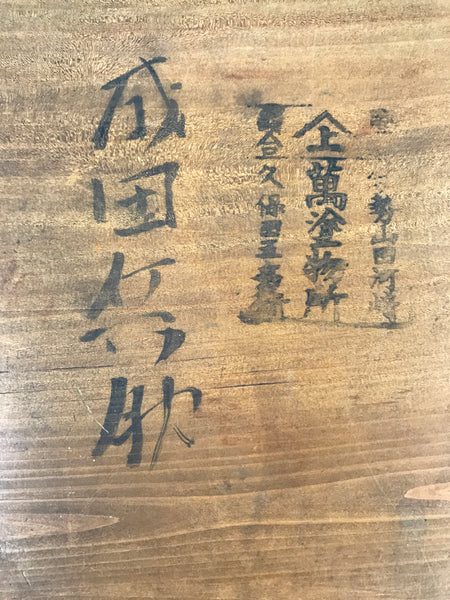 • Characters on the bottom: 伊勢山田河崎 ise yamada kawasaki  placename, 萬塗物所 yorozu nurimonodokoro name of lacquerware workshop, 久保田 五兵衛 kubota gohei male name, 成田 兵助 narita heisuke male name