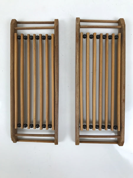 This is a pair of vintage Japanese bamboo wet towel trays called oshibori-oki. The trays are made of bamboo and brushed with translucent lacquer. The design features a slatted board-like bottom with black beads between the sticks. The trays are rectangular and flat with raised sides. These are used to present and hold wet towels for guests during meals.