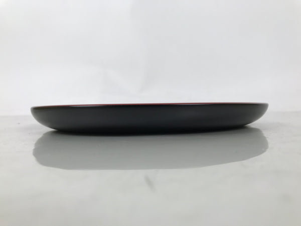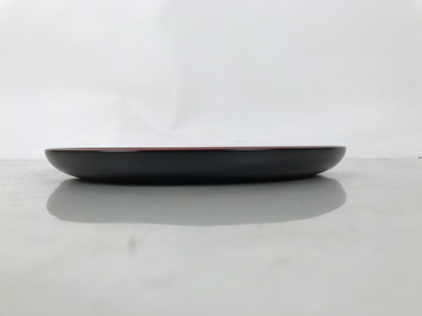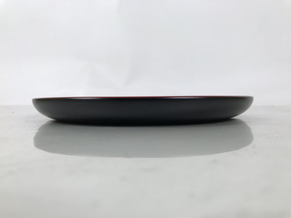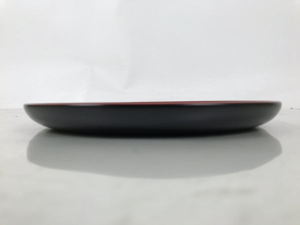 A bright red lacquer on the front and black on the back, this vintage lacquer Japanese serving tray is made of wood. It is round with slightly raised sides so drinks cannot easily slide off. It features a carved image of a wreath made up of an iris flower and its stem and leaves in the Kamakurabori style. It comes with the original paper box.