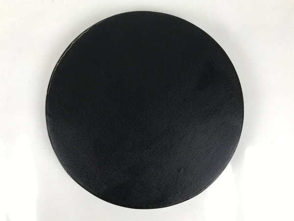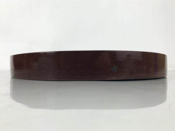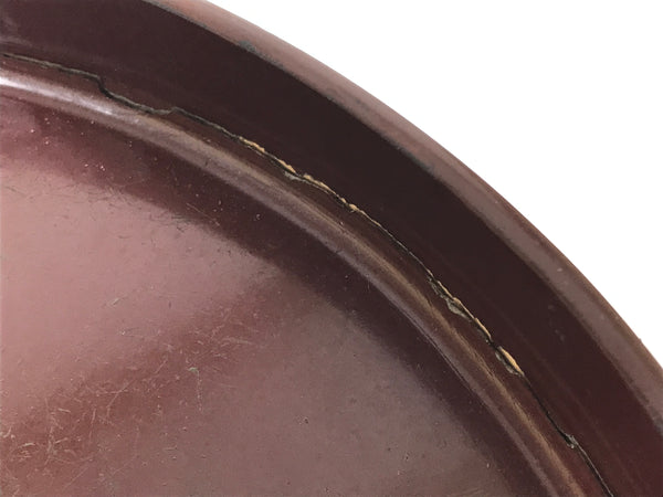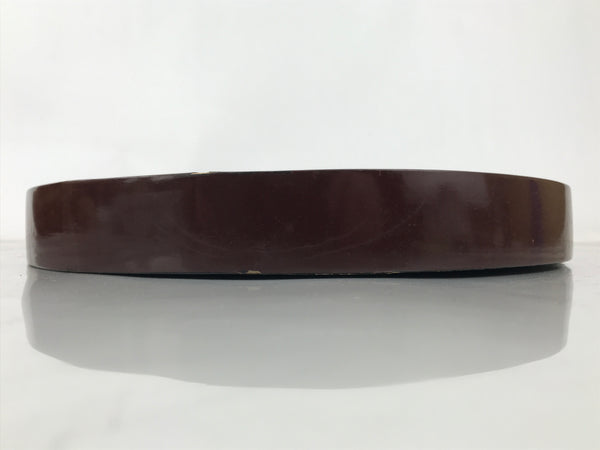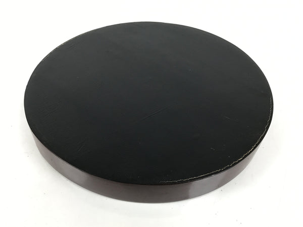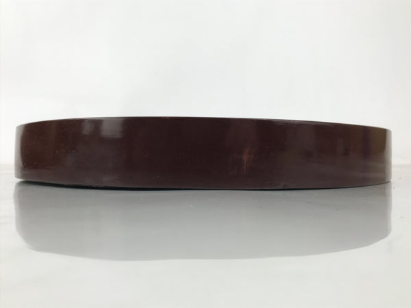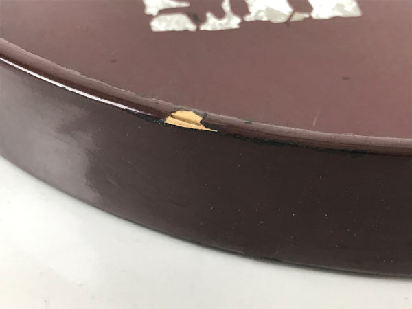 This is a vintage wooden serving tray, or obon. It is round with a raised edge. The tray is brown on the inside and outside edges, and has a textured black bottom on the outside. It features different-color marks, and some of them have a Kanji design that is likely a signature. It comes with the original paper box.