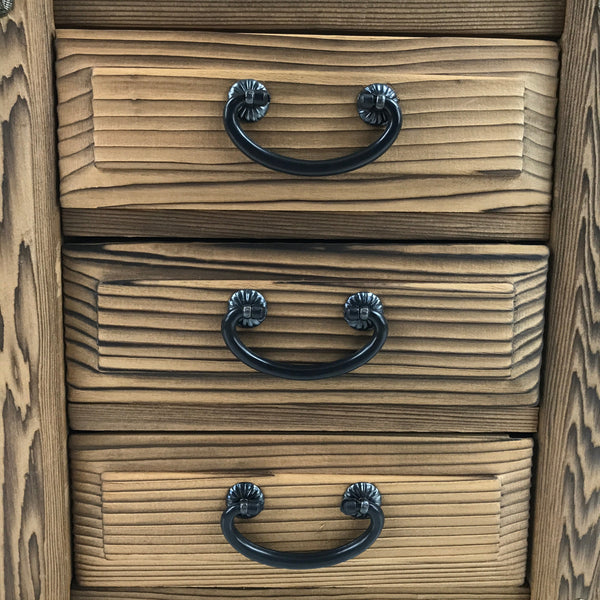 This is a vintage Japanese storage chest, also called tansu. A natural brown color and rustic texture and look, this small chest has three same-size drawers. It has simple hardware made of metal brackets and plastic handles. It comes with the original paper box. This beautiful tansu chest can be used for storing sewing supplies, jewelry, or other trinkets.