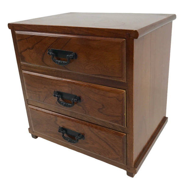 This is a vintage Japanese storage chest, also called tansu. A medium brown color with a clear brushed lacquer finish and an overall simple design, this small chest has three same-sized drawers with decorative metal hardware. This beautiful tansu chest can be used for storing sewing supplies, jewelry, or other trinkets.