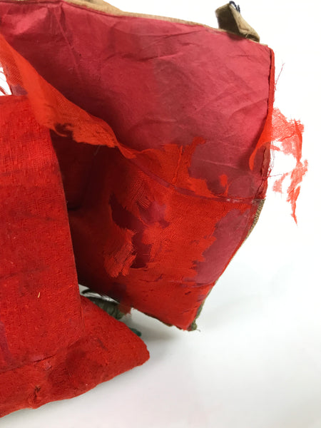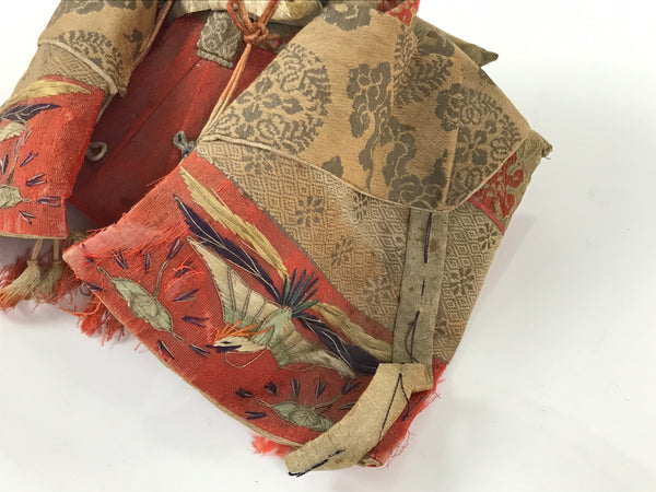 This antique princess ohinasama doll dressed in a silk kimono is the perfect addition to any existing hina set or adds gorgeous Eastern flair to any home decor. The kimono is adorned by two hand-embroidered birds, likely phoenixes. This princess doll comes with a wooden stand, likely newer than the doll itself, decorated with a tatami-like resin-and-fabric piece. The doll's head is made of wood covered in gofun. The head is removable. Both the kimono and hair are made of silk. The crown is missing.