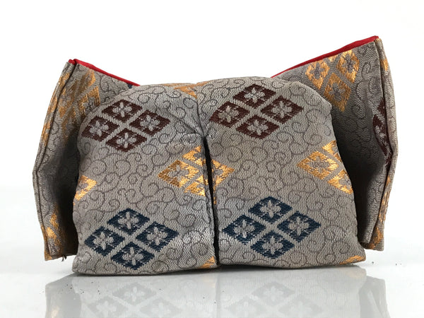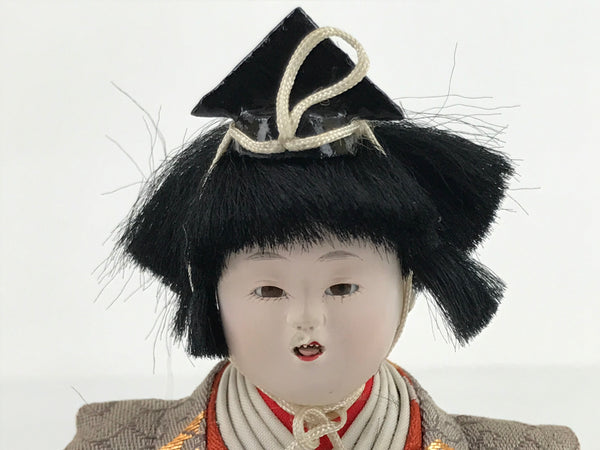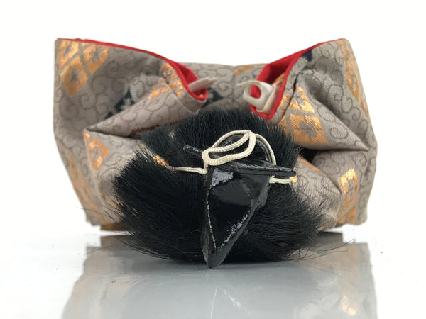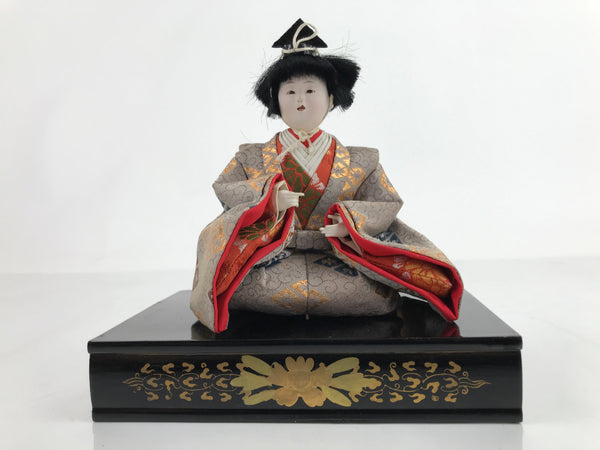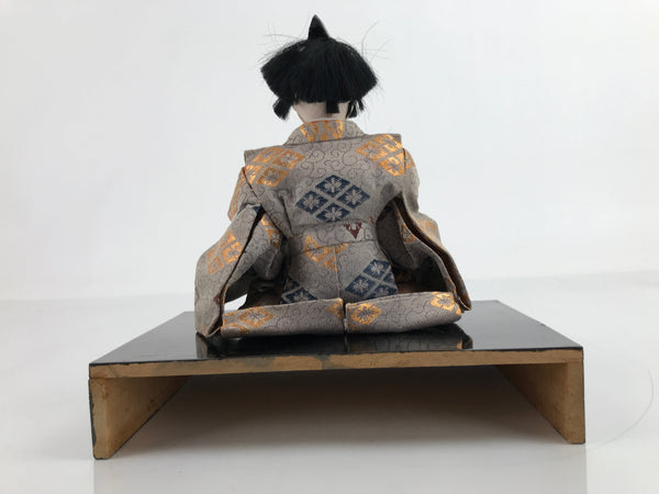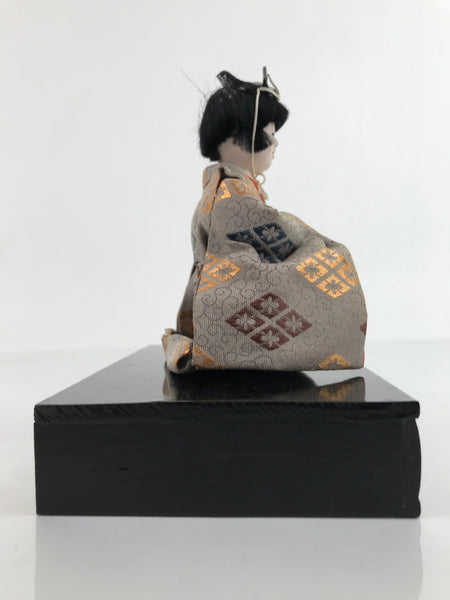 This vintage Japanese wooden court musician doll wears a gorgeous light brown kimono coat with a family crest pattern on it and a small black hat. This is a quality hina doll made of silk and wood and the head is removable as it was handcrafted separately from the body with a wood base and gofun, a white chalk commonly used in crafting doll faces made from the shells of oysters, clams, etc. This doll sits on a wooden lacquered stand decorated with maki-e art on the front. This elegant doll is an excellent addition to any Hina doll collection.