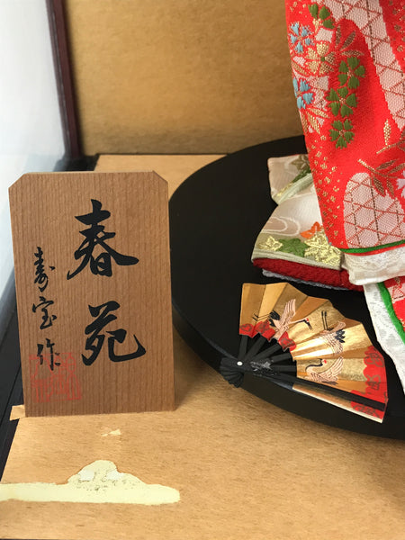 This gorgeous vintage princess ohinasama doll is dressed in a red, blue, gold, green, and cream kimono with nadeshiko carnation flowers and rivers. She has a golden fan with tsuru cranes on it. The doll's face is likely gofun and the hands are made of resin. This doll is placed in a glass case that opens from the front. The doll is wired into the bottom. It is a lovely display item of a generous size. The fan is detached. The sign with inscriptions on it is detached from the bottom.