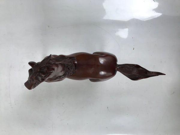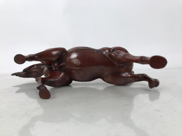 This is a vintage Japanese metal statue of a horse running. This detailed statue was crafted in Toyama according to traditional techniques of the Takaoka copperware production process. The horse is brown with some black accents. It has the original cardboard box.